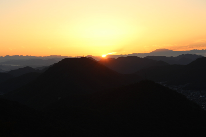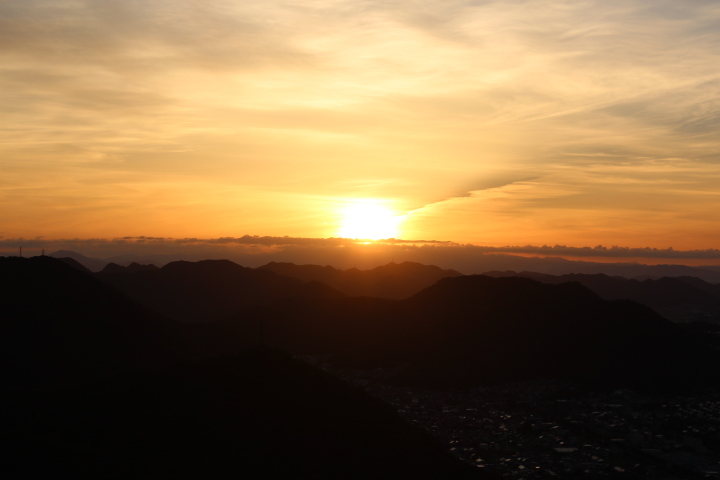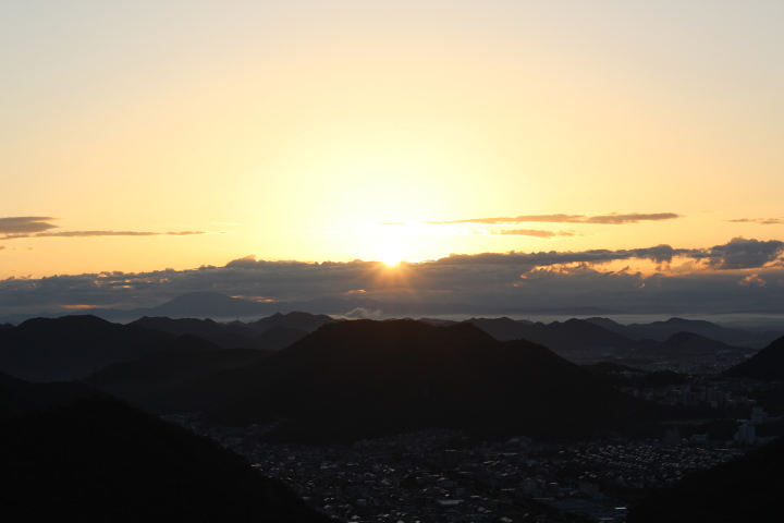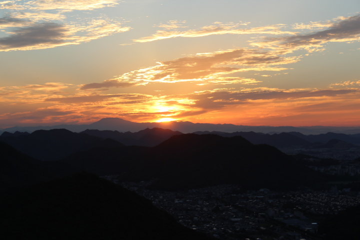 | 今朝(R7/9/19)の金華山上空は晴れ、頂上の温度計はこの秋最低の23℃を指していました。日の出は山の稜線にかかった雲の上からでした。 | ||