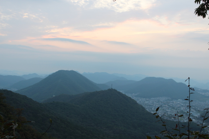 | 今朝(R7/9/10)の金華山上空は晴れ、頂上の温度計は26.5℃を指していました。日の出を待ったのですが山の稜線にかかった雲が厚くお出ましにはなられませんでした。 | ||