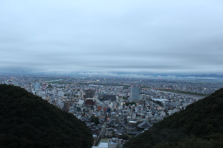 |  今朝(R7/9/13)の金華山は上空は曇り時々雨、頂上の温度計は23℃を指していました。 今朝は久しぶりにドライブウェーの展望台まで行ってきました、写真は展望台から見た市庁舎方面です(左の橋が大縄場大橋、右の橋が忠節橋)。  |
