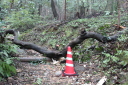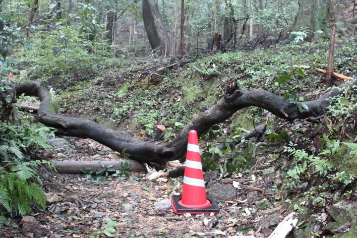 |  今朝(R7/9/15)の金華山上空は晴れ、頂上の温度計は26℃を指していました。日の出は山の稜線にかかった雲が高くまであり望めそうにありませんでした。雲海ができていました。 今朝もまた、東坂登り口で倒木がありました(写真右)。  |