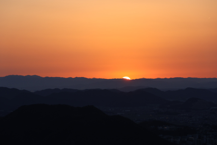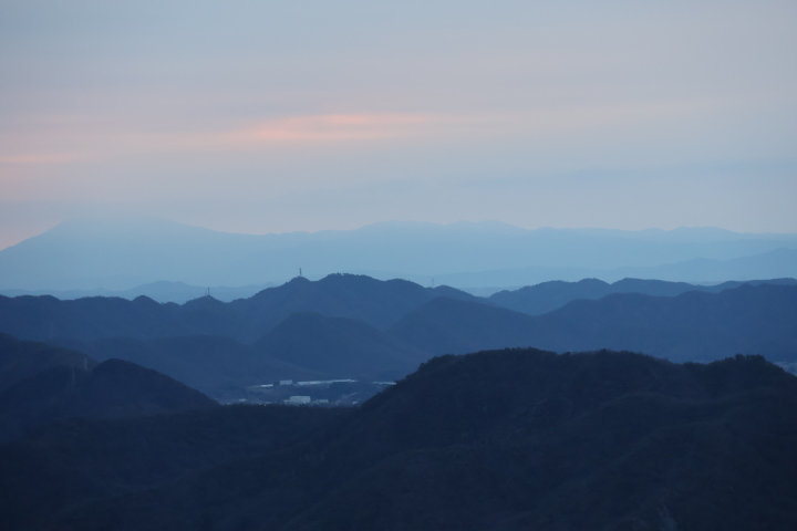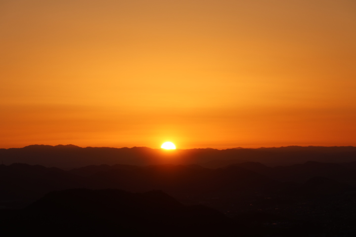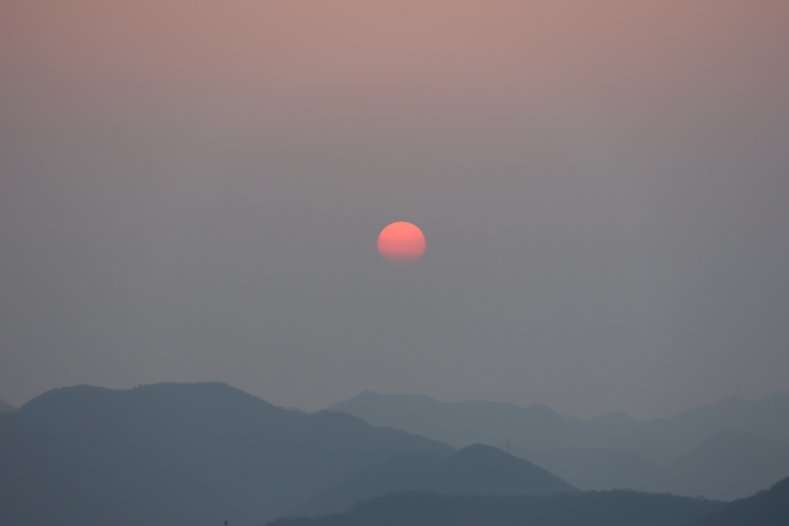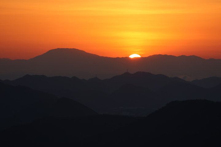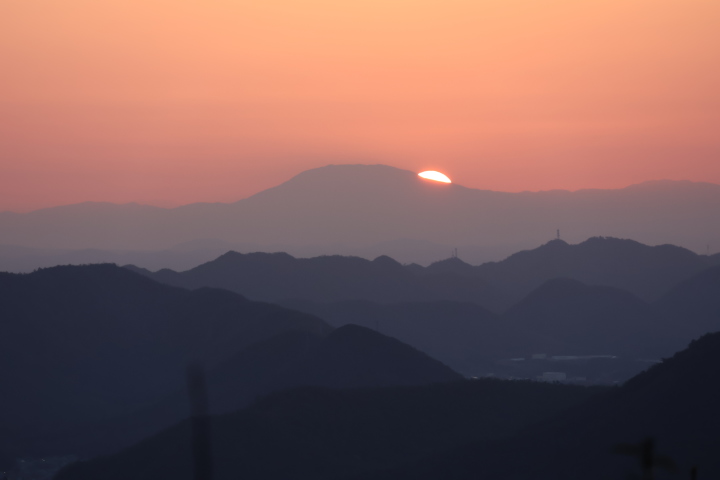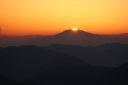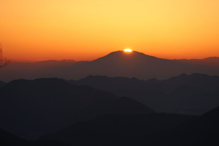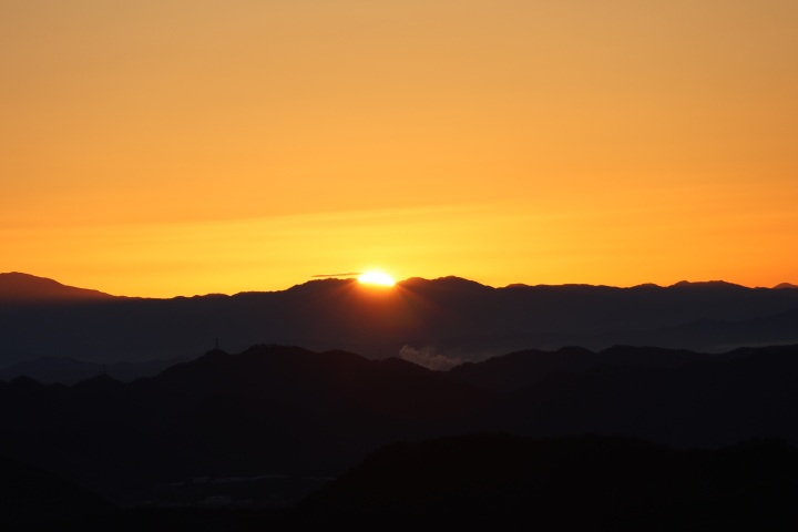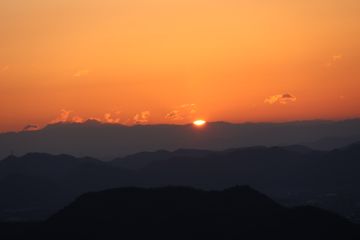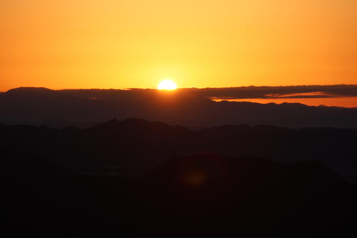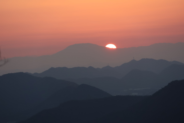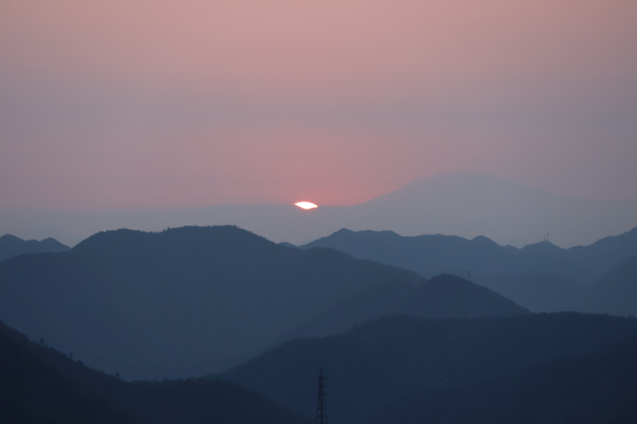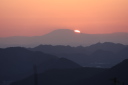 | 今朝(R8/3/20)の金華山の天候は晴れ、頂上の温度計は5℃を指していました。日の出は奇麗に晴れ上がった恵那山南麓の稜線からでした。 | |
