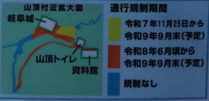 | 令和7年11月25日(火)より令和9年9月末頃まで瞑想の小道(鼻高登山道を含む)から岐阜城へは行けなくなりましたので注意してください。 岐阜城周辺の通行規制は写真のとおりです。 |