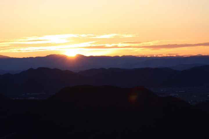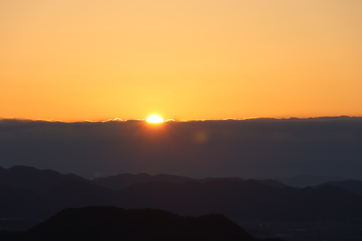 | 今朝(R8/3/11)の金華山の天候は晴れ、頂上の温度計は0℃を指していました。日の出は山の稜線にかかった雲がありその上からとなりました。 | |