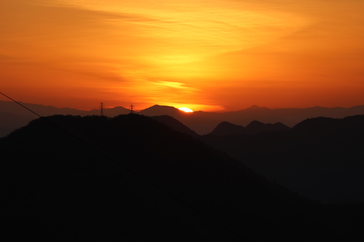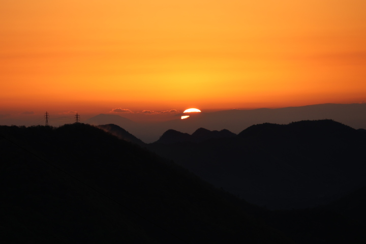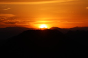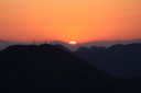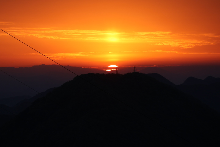 | 今朝(R8/4/1)の金華山の天候は晴れ、頂上の温度計は12℃を指していました。日の出は山の稜線にかかった雲の上からでした。関市方面は雲海に包まれていました(写真左の方です)。 |